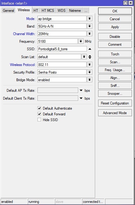 Amigo, eu usava um Rocket m5 com Basestation 20dbi para fazer uma Bridge entre as Woom 5000 e minha RB2011(pppoe), mas ontem meu Rocket queimou e não tenho outro pra substituir, aconteçe que tenho uma Rb912 aqui de reserva, mas confeso que mikrotik não é minha praia e queria que me ajudasse a configurar a 912 no lugar do Rocket...Tentei aqui mas algumas Woom não enxergavam ela e outras conectavam mas não passavam pra RB2011 (pppoe). Agradeço aos que me ajudarem.