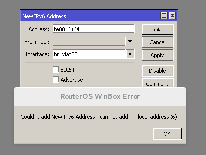 Olá pessoal, estou tentando configurar um endereço link-local em uma interface no Mikrotik, mas ele não aceita que eu especifique manualmente um endereço, só deixa usar o endereço gerado automaticamente (EUI64). Aparece o seguinte erro: