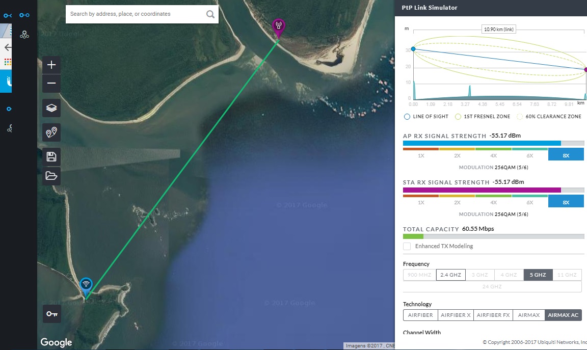 Bom dia, estou compartilhando um link meu de 11 km sobre o mar, onde o link está passando 95 megas de envio e 85 de recebimento, testes realizados no speed test do próprio powerbean e no bandwidth test da miktrotik. Equipamento powerbean 5ac 400.