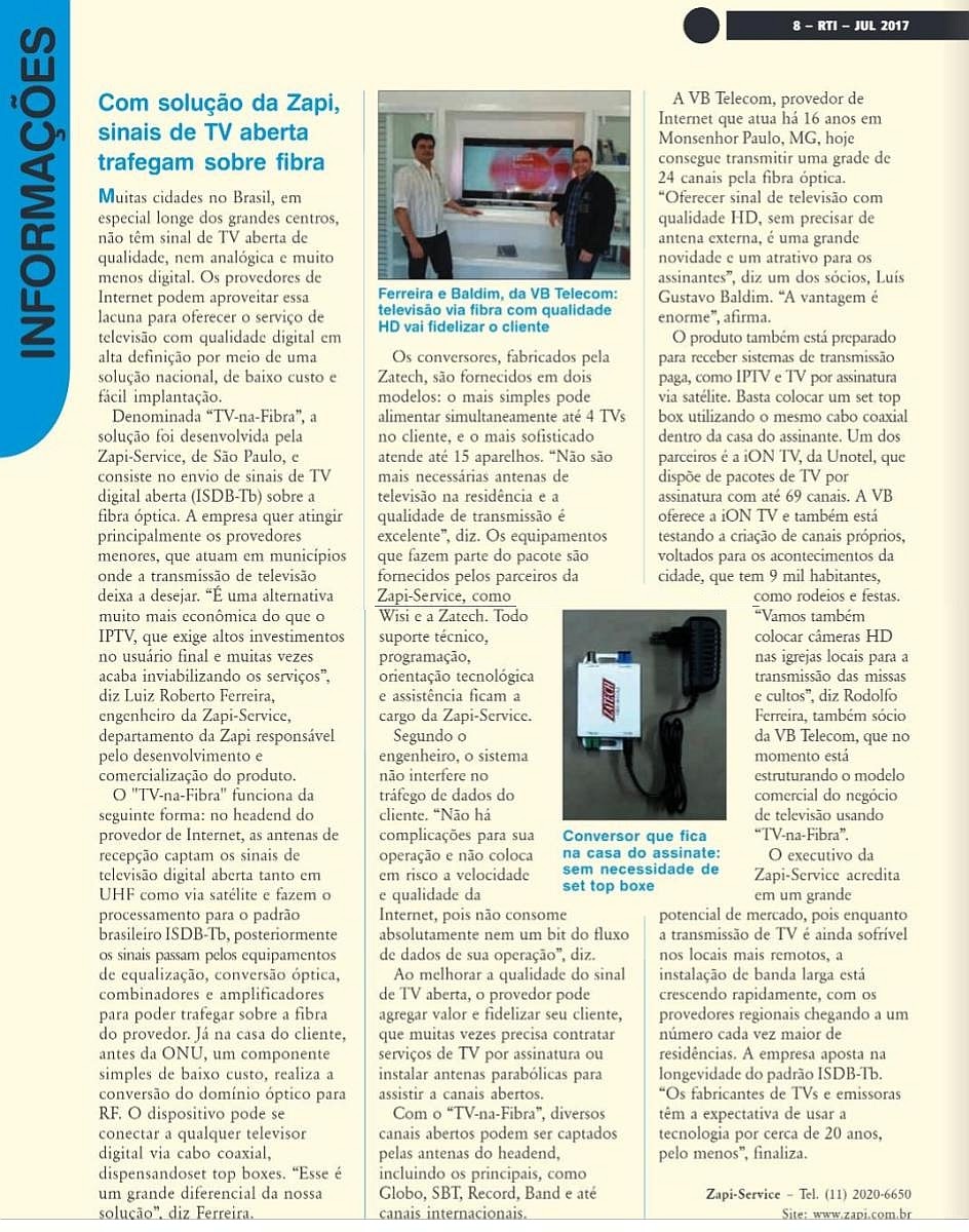 Conheça nossos sistemas de transmissão de TV (Aberta, Paga ou Institucional) por meio de fibras ópticas com a melhor relação custo benefício do mercado, com qualidade Digital em Alta definição (HD) e sem complicações para sua operação, sem colocar em risco velocidade e qualidade da internet de seus clientes pois não consome absolutamente nem um bit do fluxo de dados de sua operação. Nosso sistema é muito simples e eficiente, e vem ao encontro de operadoras que querem agregar valor e blindar suas operações oferecendo TV Aberta e/ou Paga de altíssima qualidade a seus clientes de maneira muito simples e e de baixo custo podendo também expandir a qualquer momento para um modelo de TV Paga com os principais canais do mercado sem complicações.