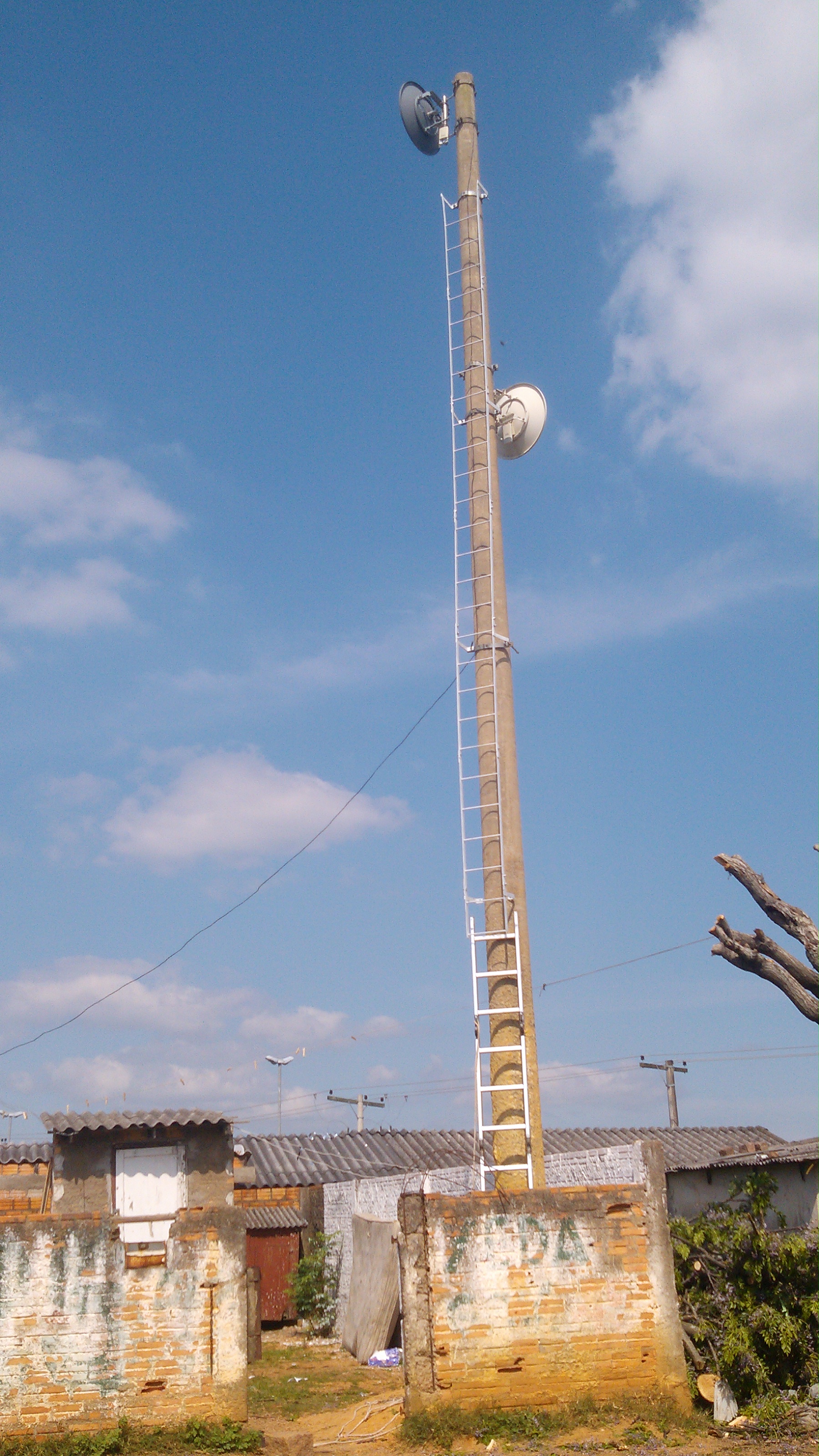 Ainda mandei fazer uma estrutura de ferro pra colocar no topo do poste aonde vou colocar os rádios. Ficou uma gambiarra com uma cara bem profissional, o ponto a ponto que vai levar o link já ativei hoje mesmo e ficou filé, com duas nanobridge que por sinal estava parada aqui sem utilidade, o link esta passando 70MB com potencia bem baixinha.