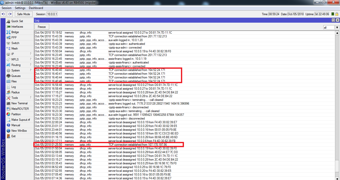 Olha pessoal, meu nome é Lucas Fernandes, sou administrador júnior de uma rede corporativa e ultimamente tenho tido alguns problemas com conexões TCP. Trabalho com uma RB 450G, a mesma esta atualizada na versão 6.43, e o meu problema é que alguns IP extrangeiros tem se conectado via TCP porém ninguém alem das VPNs deveria se conectar.